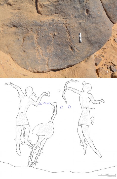 „Dabei zeigt der Bogenschütze deutlich die Jagd auf den großen Laufvogel, während der Mann mit den erhobenen Armen als ein Jagd-Tänzer gedeutet werden kann“, berichtet Prof. Morenz. Der Tänzer trägt anscheinend eine Vogelmaske. Die Szene erinnert an die Vorstellungswelt von Jagd, Masken und Schamanismus, wie sie aus vielen Erdteilen bekannt ist – unter anderem von der Straußenjagd der „San“ (sogenannte Buschmänner).