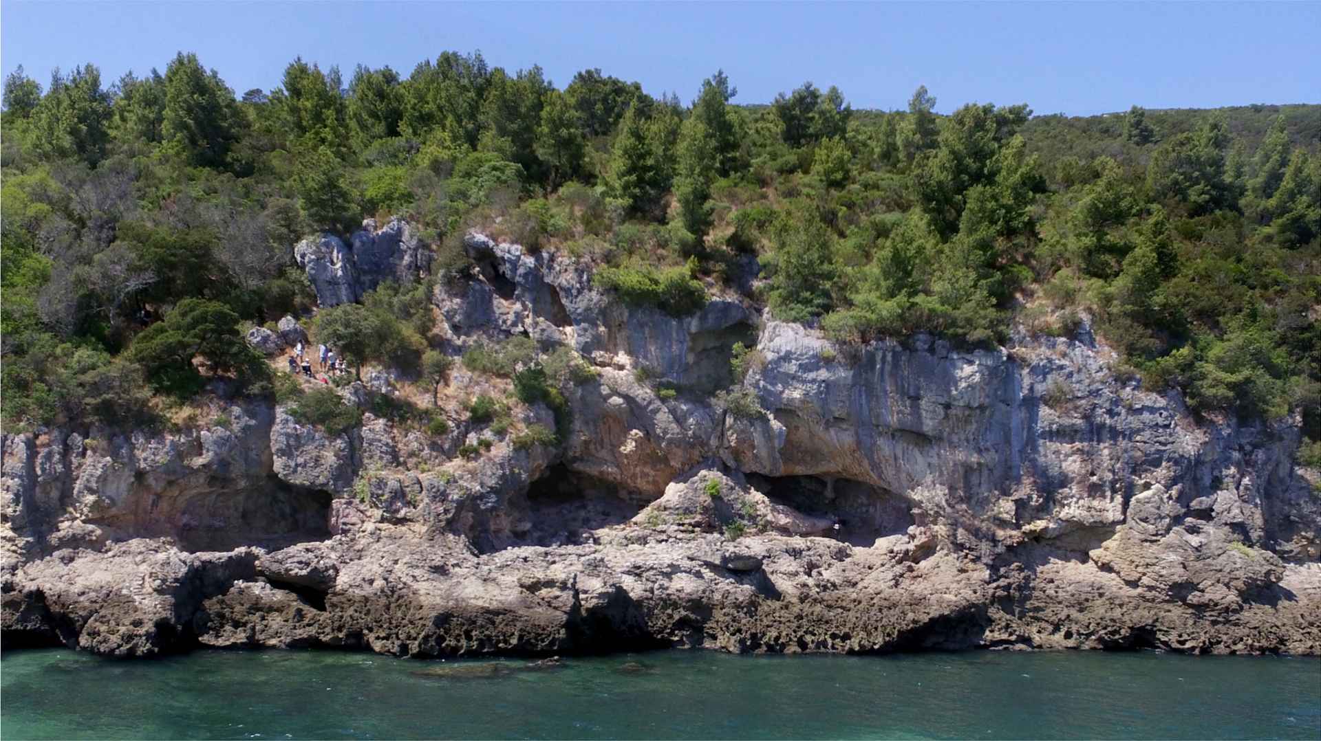 Blick auf die drei Eingänge der Höhle von Figueira Brava in Portugal.