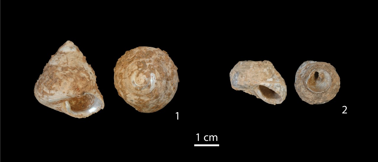 Gehäuse der Meeresschnecke Phorcus turbinatus. Drauf- und Seitenansicht von 1) einem kompletten Exemplar und 2) einem Gehäuse, dessen oberer Teil von Menschen des Jungpaläolithikums abgeschnitten wurde.