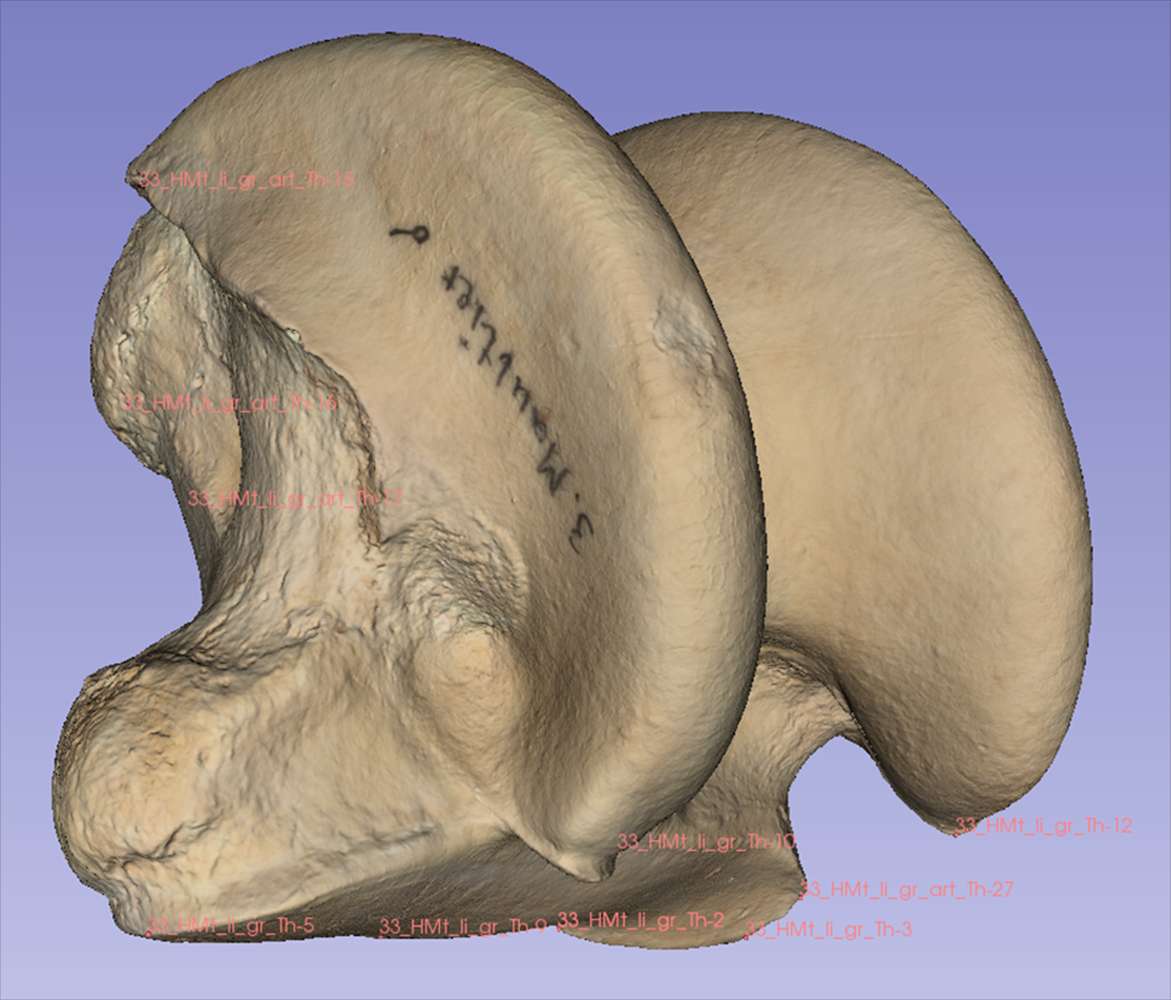 3D Ansicht des linken Talus (Sprungbeinknochen) eines Maultieres (männlich, kastriert) aus der Staatssammlung für Paläoanatomie München.