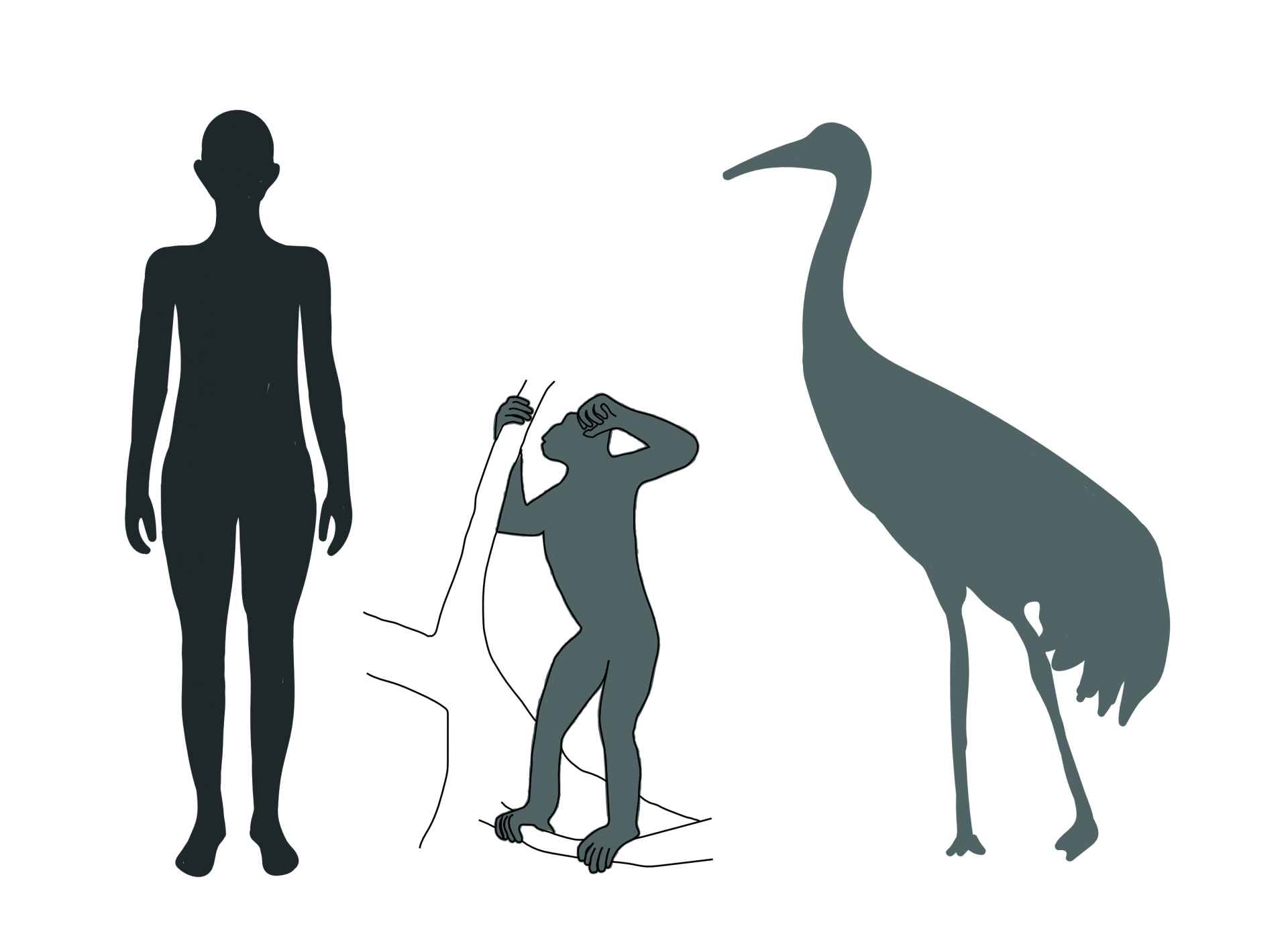 Vergleich der Silhouetten eines heutigen Menschen (Körpergröße 175 cm) mit Danuvius guggenmosi (das männliche Individuum ‚Udo‘) und dem Riesenkranich aus der Fossilfundstelle Hammerschmiede im Allgäu, Bayern.