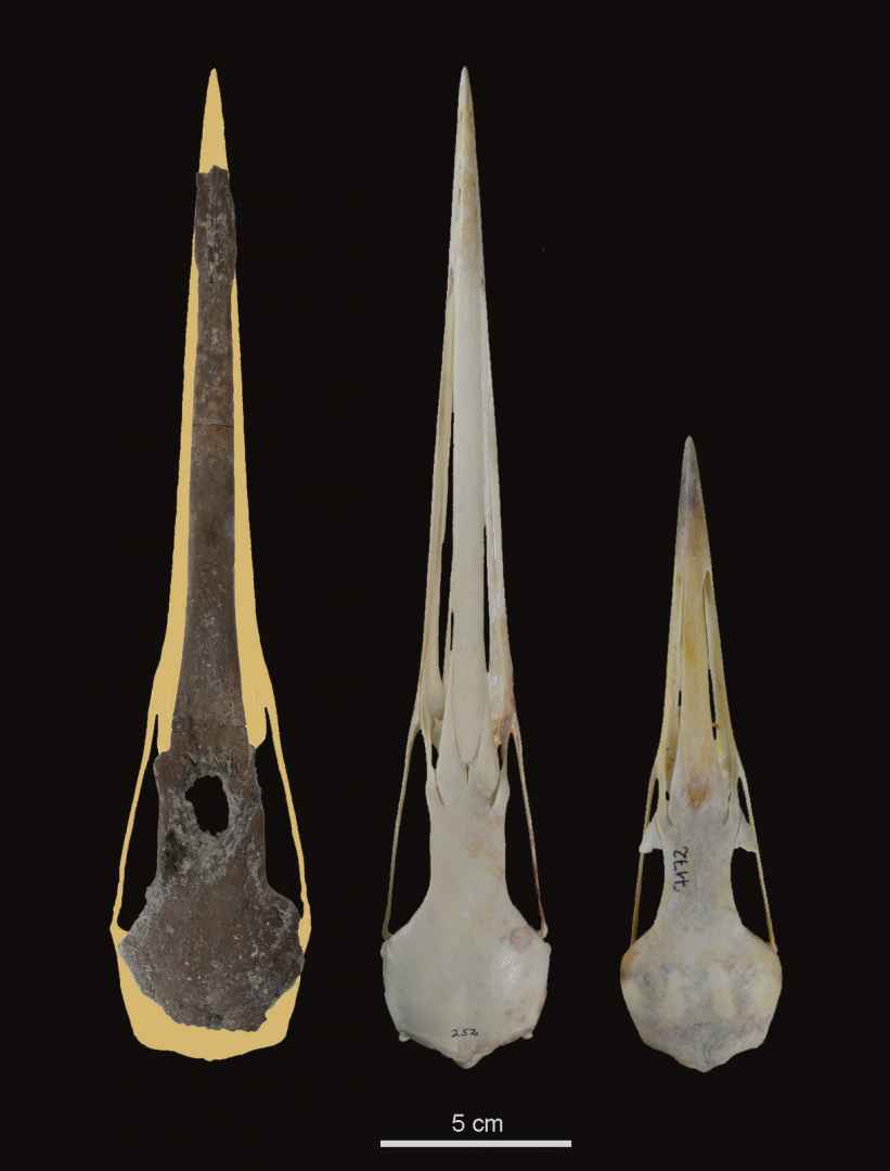 Der Schädel des Kranichs aus der Fossilfundstelle Hammerschmiede (links) im Vergleich mit dem heutigen Sibirischen Kranich (Mitte) und dem in Deutschland heimischen Eurasischen Kranich (rechts), welcher einen deutlich kürzeren Schnabel besitzt.