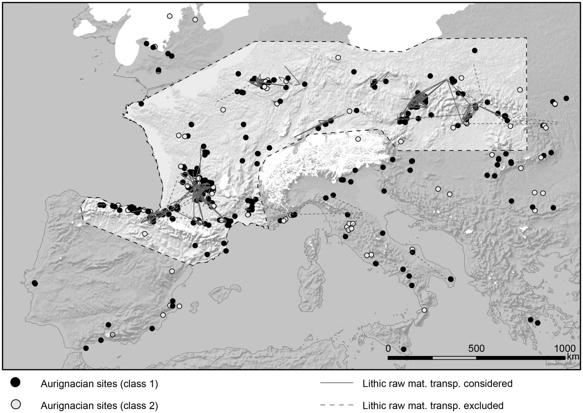 Fundorte, die dem Aurignacian in Europa zugeordnet werden. Schwarz: Klasse 1, grau: Klasse 2 (d. H. von Berechnungen ausgeschlossen). Graue Linien: Transportwege von Rohstoff.