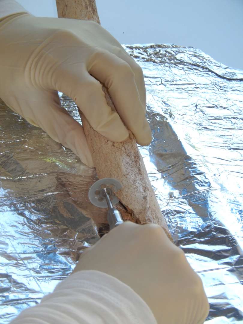 Einem menschlichen Knochen aus der Sammlung der Höhlen von Serinyà wird im Archäologischen Museum von Banyoles eine Probe entnommen.