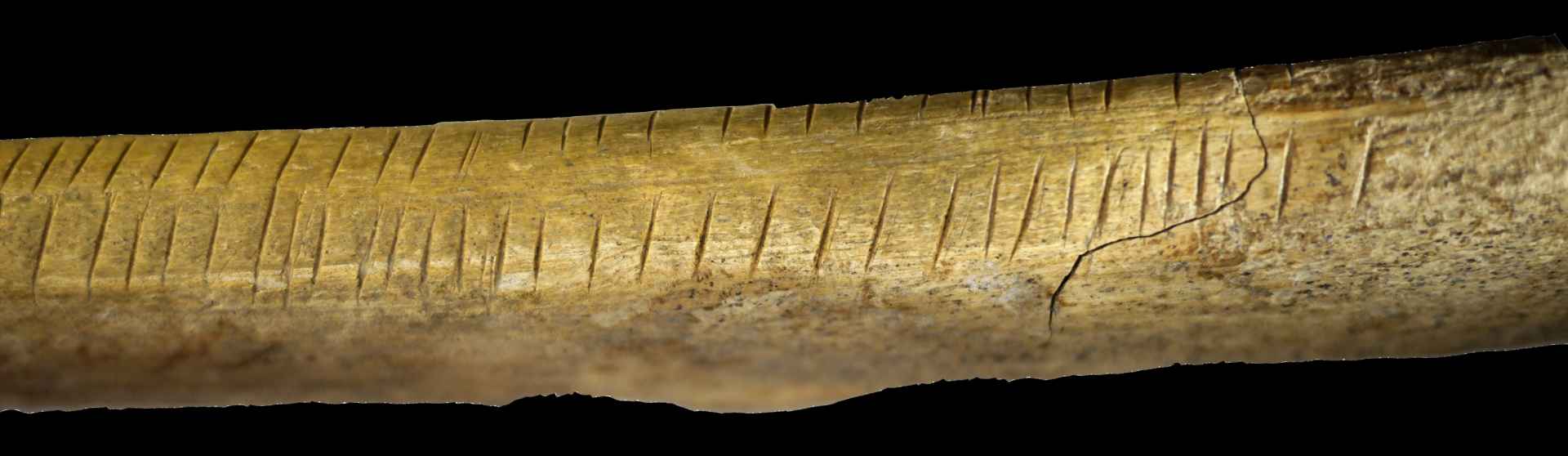Ganz besonders auffällig ist die dickere Kante der Rippe: Sie weist zwei Reihen von Markierungen auf. Eine zeigt 83 und die andere 90 Striche. An anderer Stelle weist die Rippe weitere 13 schwächere und längere Einschnitte auf. All diese Markierungen sind sehr gut erkennbare, saubere Einschnitte, die mit Sicherheit gezielt platziert wurden. Sie unterscheiden sich in Länge und Tiefe und wurden wahrscheinlich nicht in einem Durchgang eingeritzt.