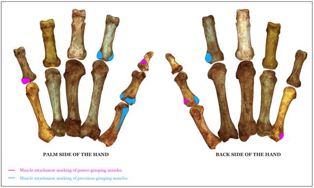 Die Untersuchungen zeigen, dass Neandertaler bei ihren händisch ausgeführten Tätigkeiten systematisch „Präzisionsgriffe“ einsetzten. Im Gegensatz zum „Kraftgriff“, bei dem die gesamte Handinnenfläche einschließlich aller Finger und des Daumens zugreift, erfolgt beim „Präzisionsgriff“ die Haltung und Führung von Gegenständen im Wesentlichen durch die Fingerkuppen von Daumen und Zeigefinger.