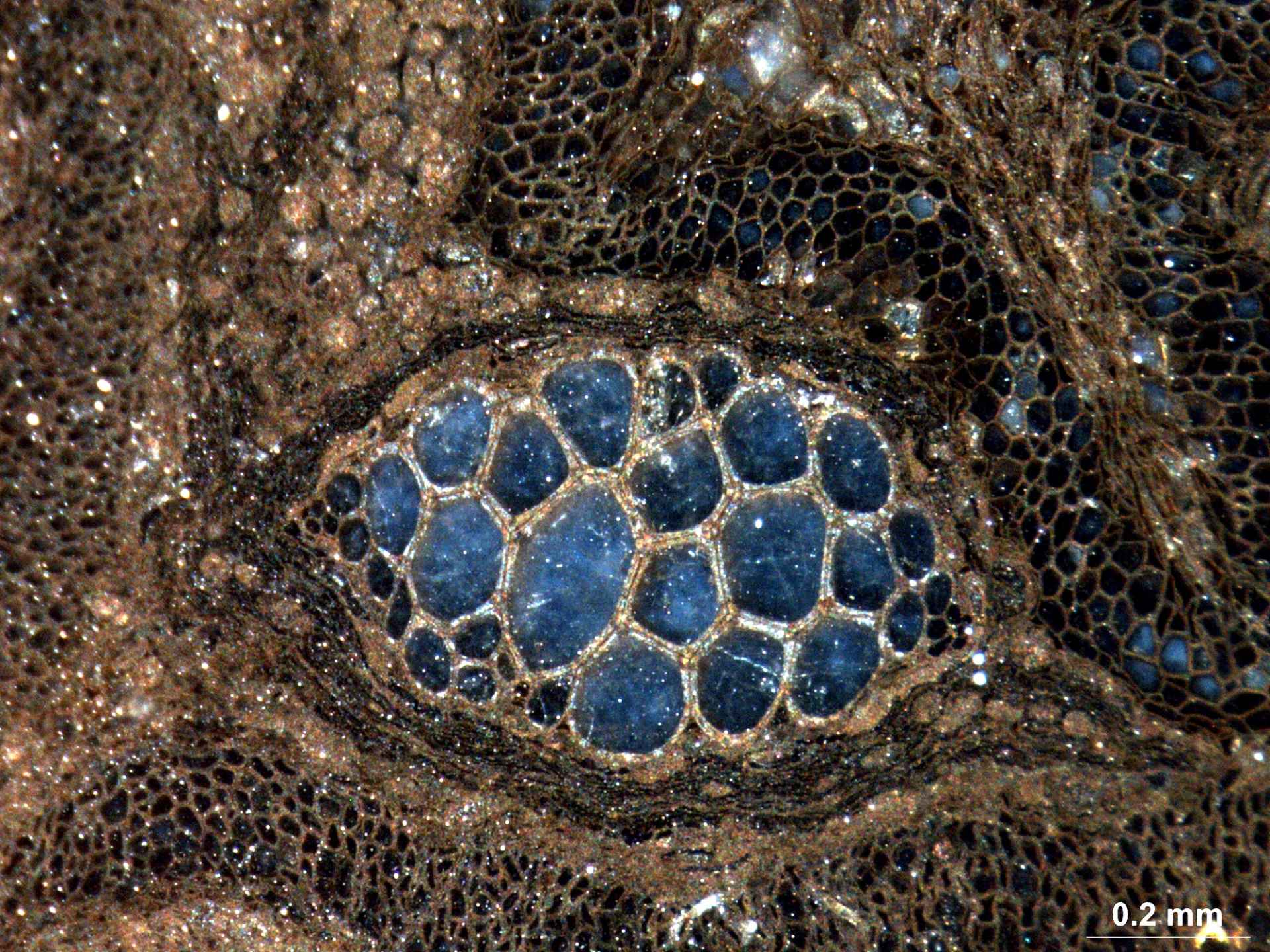 Vergrößerung eines Ausschnitts des fossilen Baumfarnstammes aus Manebach mit Zellen.