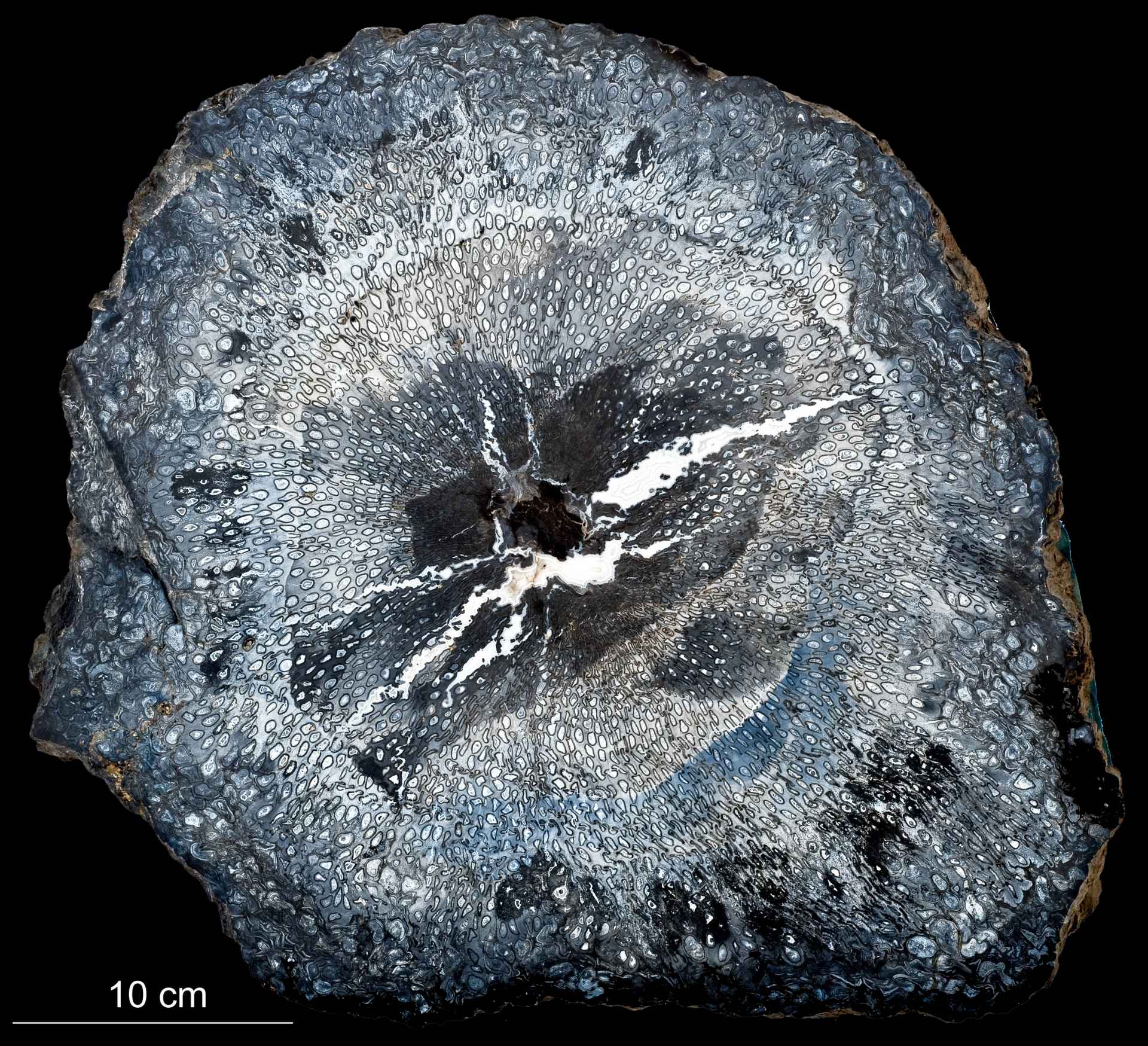 Polierte Scheibe eines fossilen Baumfarnstammes aus Manebach.