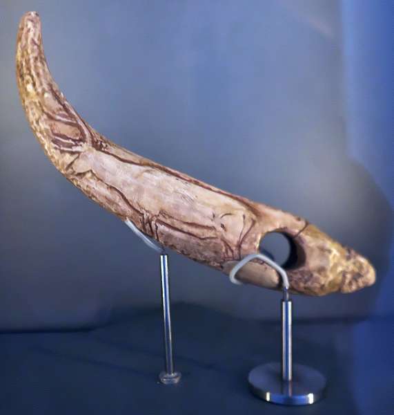 Stock mit Hirschfigur und Geweih aus dem Magdalenien (13.000-11.500 Jahre). Ausgestellt im Altamira Museum.